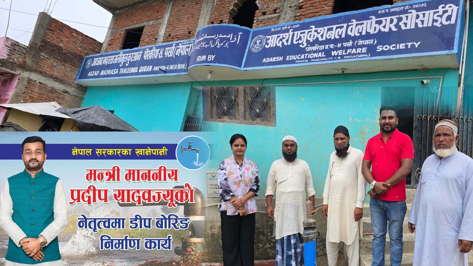 खाने पानी मन्त्रि मा० प्रदिप यादव द्धारा सँचालित १ घर १ धारा सफा र स्वच्छ पानी, स्वस्थय जिवन नारा सहित हर घरमा धारा तथा धाराको पाईप लाईन जडान हुने अभियान अन्तर्गत सो डिप बोरिन जडान भएको खाने पानी मन्त्रि प्रदिप यादवको स्वकिय सचिव । हरिन्द्र साहले जानकारी दिए । पर्सा जिल्लाको केन्द्र विन्दु पर्साको दोश्रो सदरमुकामको रुपमा रहेको पोखरिया बजार श्रेत्र भित्र रहेका सेवा प्रदायक सँघ सँस्था पोखरिया अस्पताल, मालपोत कार्यालय पोखरिया ,नापी कार्यालय पोखरिया , ईलाका प्रहरी कार्यालय पोखरिया , नेपाल विधुत प्राधिकरण पोखरिया वितरण केन्द्र पोखरिया , लयागयत सेवा प्रदायक सँघ सँस्था सहित सार्वजनिक ठाउँमा स्वच्छ खाने पानी बाट आम जनतालाई वँचित हुन नदिन आवस्क्ता अनुसार अझ डिप बोरिन थप गरिने खाने पानी मन्त्रि मा० प्रदिप यादवको सचिवालयले जनाएको छ ।
